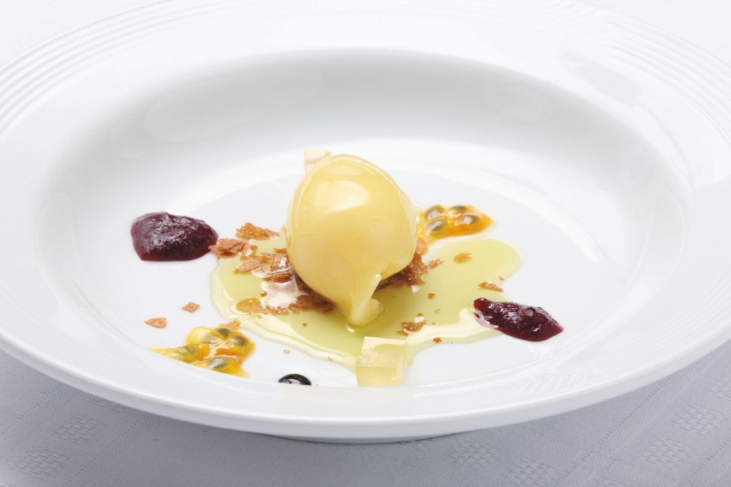 Este plato me recordó el sorbete de curuba que acompaña al tradicional ajiaco, mientras que el crocante se asemeja a cómo luce la cordillera de los Andes desde el avión.