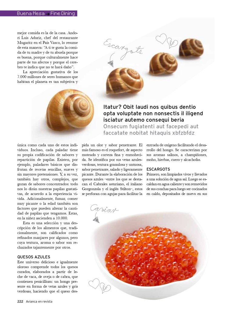 Además de su alto valor proteico y bajo contenido de grasa, el sabor de los escargots es similar al de cualquier molusco, de textura firme, color claro y frescura notable. Es calificado como ‘de gusto delicado’ y sabor típico del caracol.