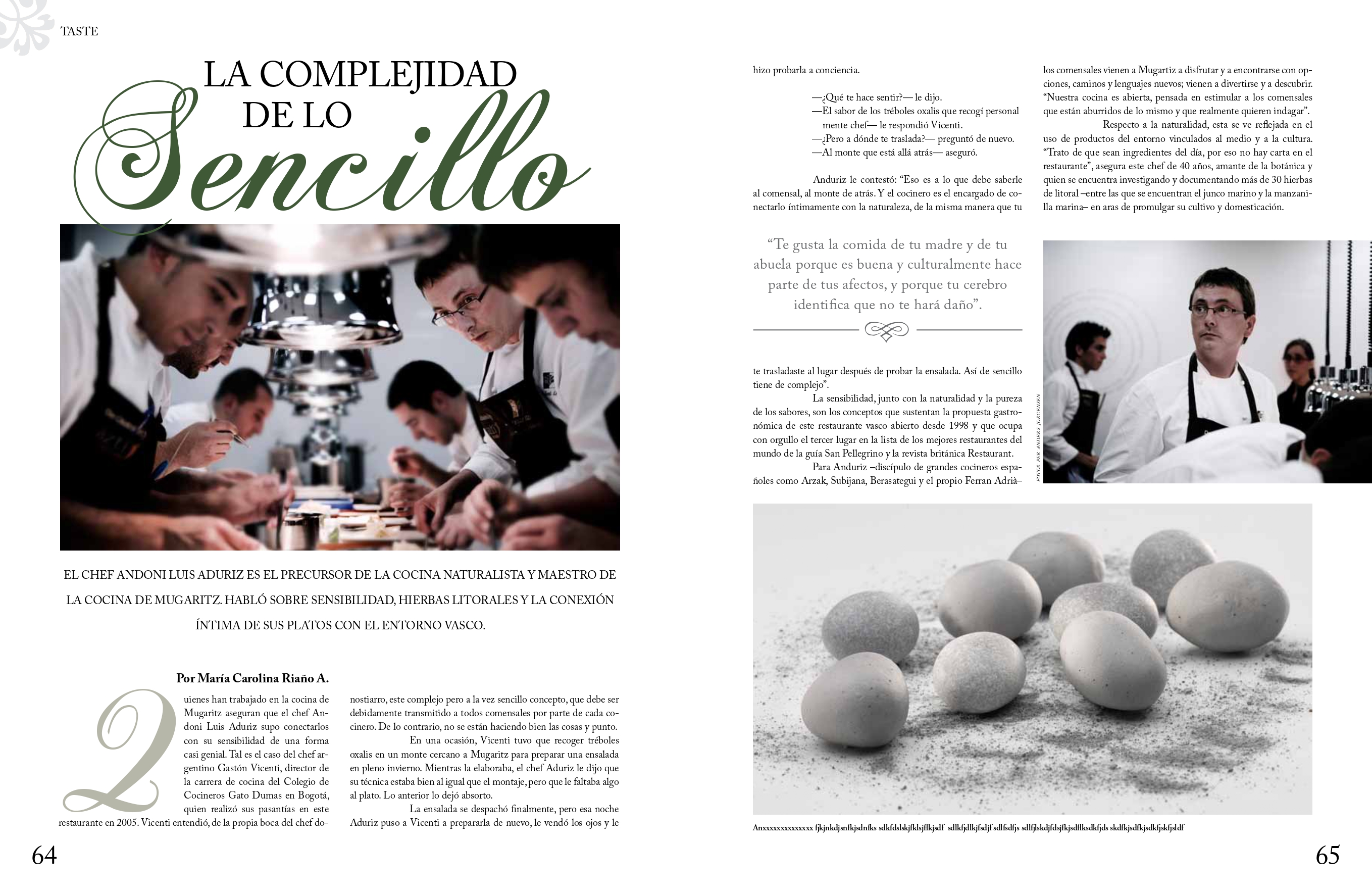 Anduriz le contestó: “Eso es a lo que debe saberle al comensal, al monte de atrás. Y el cocinero es el encargado de conectarlo íntimamente con la naturaleza, de la misma manera que tu te trasladaste al lugar después de probar la ensalada. Así de sencillo tiene de complejo”.