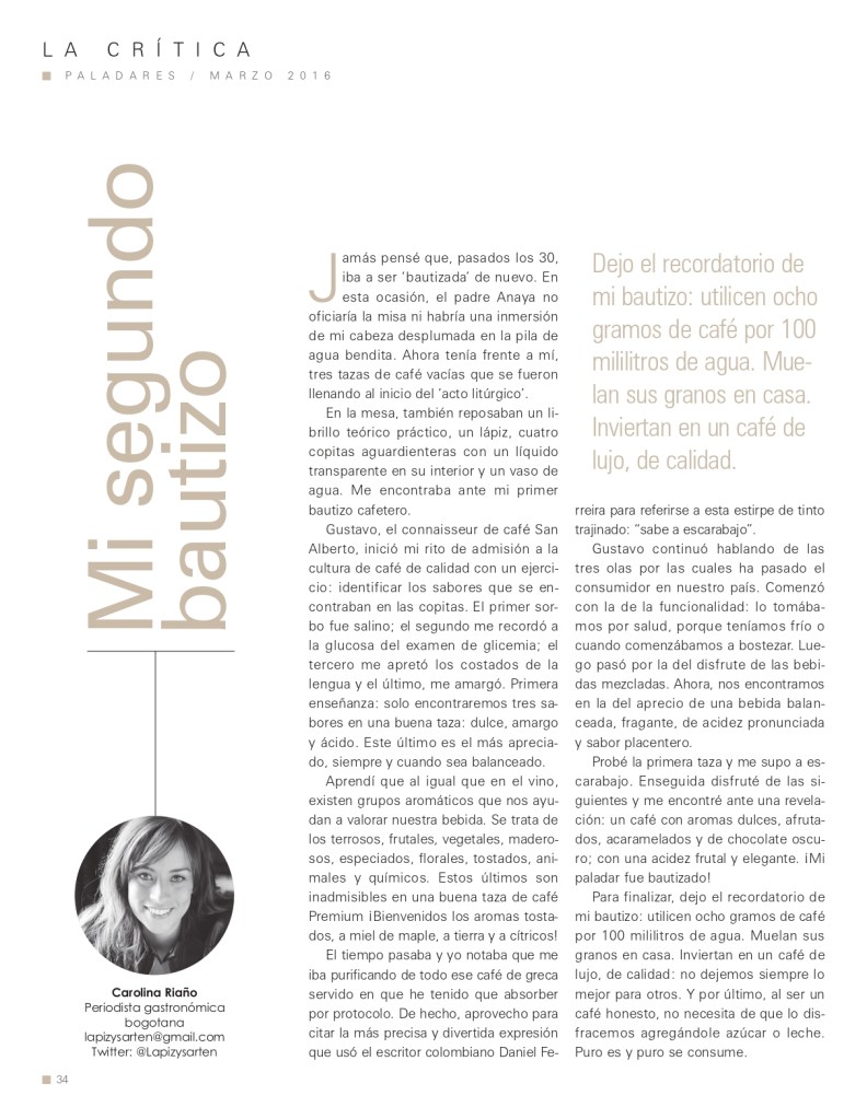 Probé mi primera taza y me supo a escarabajo. Enseguida degusté las otras dos y se postró ante mí una revelación: Existen cafés con aromas dulces, afrutados, a caramelo y chocolate oscuro; de acidez frutal y elegante. Mi paladar había sido bautizado.