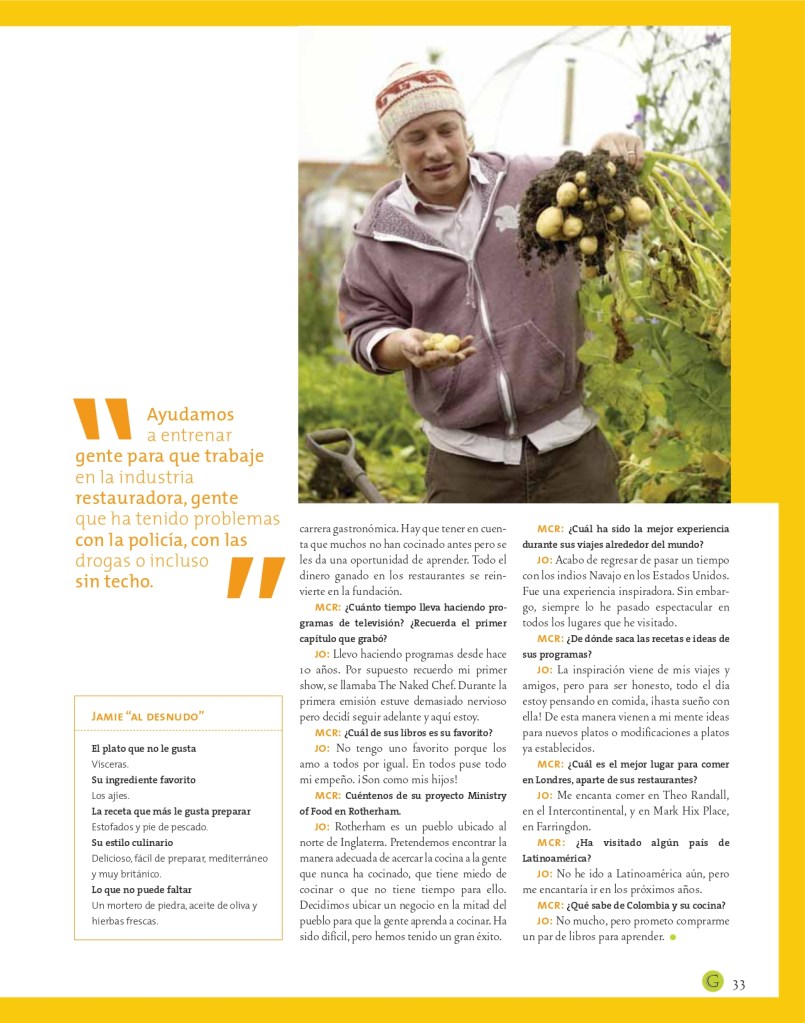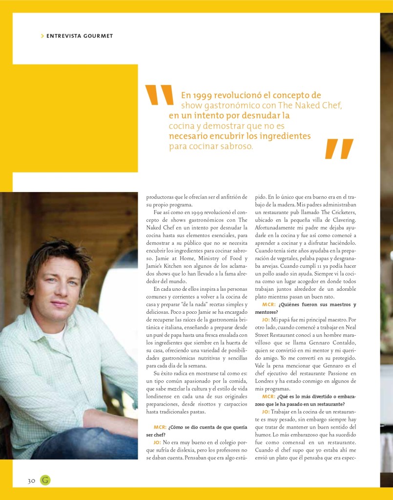 Cocina sin uniforme, prueba las salsas con el dedo e invita a sus amigos y familiares a participar en sus programas de televisión. Fenómeno mediático o culinario, Jamie Oliver es la estrella gastronómica más aclamada del Reino Unido gracias a su estilo descomplicado que acerca la cocina hasta al más escéptico.