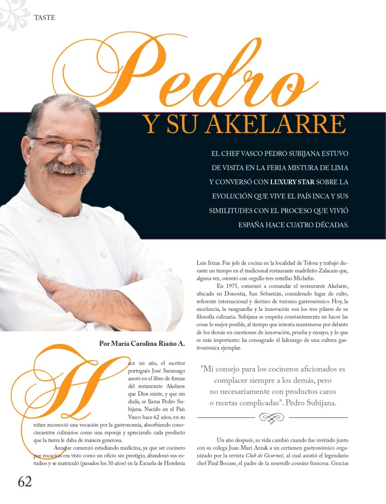 El chef vasco Pedro Subijana estuvo de visita en la feria Mistura de Lima y conversó sobre la evolución que vive el país vecino y sus similitudes con el proceso vivido en España hace ya cuatro décadas.