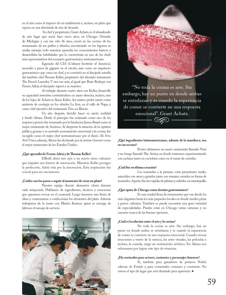 en sus recetas? Pronto abriremos un nuevo restaurante llamado Next y un lounge llamado The Aviary, en donde estaremos experimentando con cachaza tanto en coctelería como en el menú de comidas.