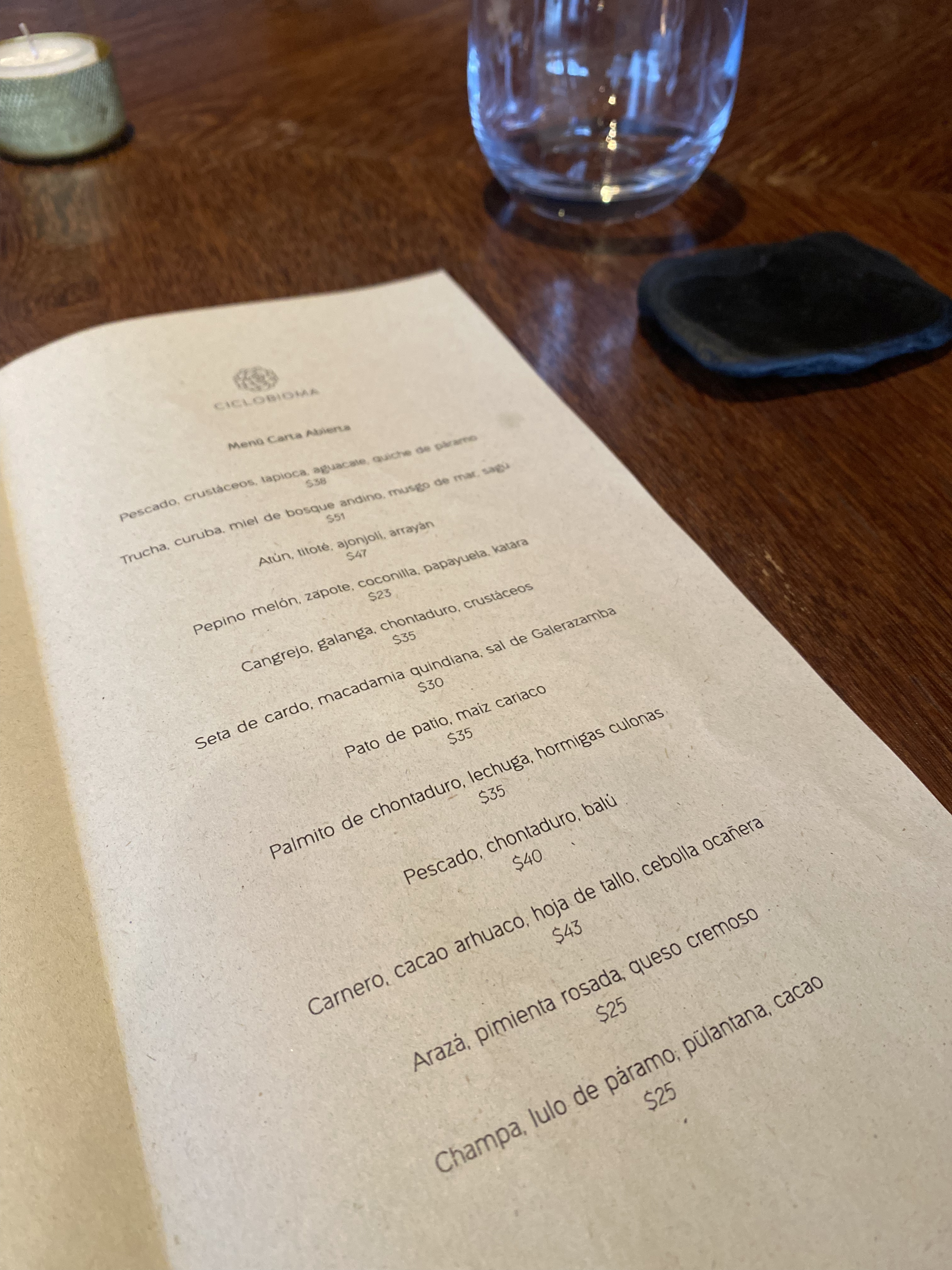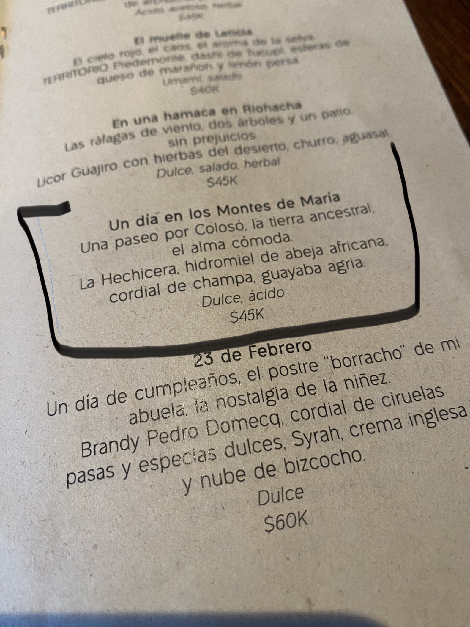 En las dos salas se ofrecen distintos menús, que denotan un trabajo de investigación, de observación y de experimentación que revela una Colombia profunda; un trabajo hecho en las comunidades alrededor del país. Podríamos hablar de la evolución de la tradición.