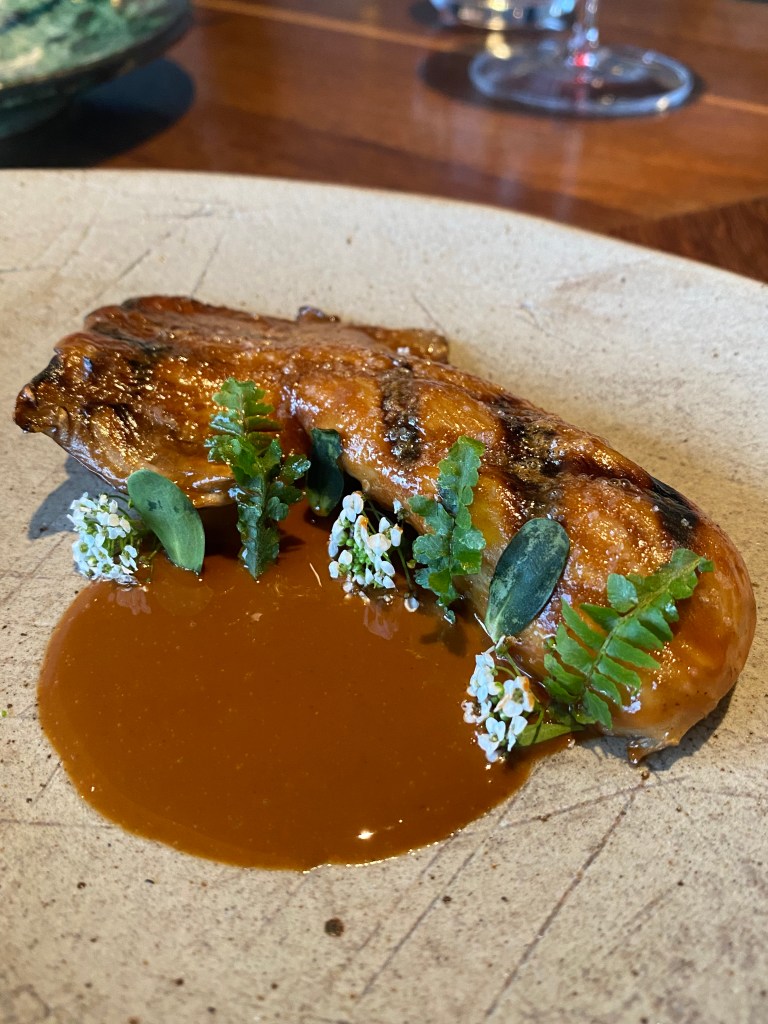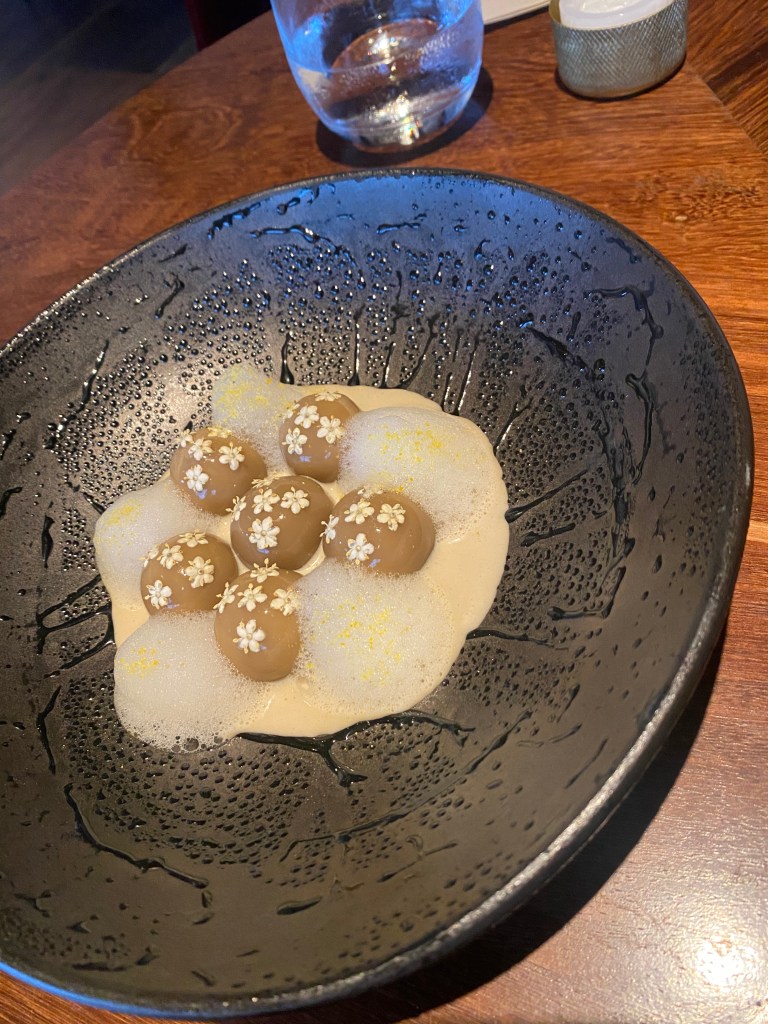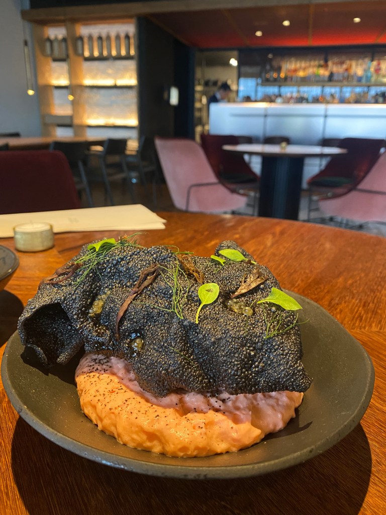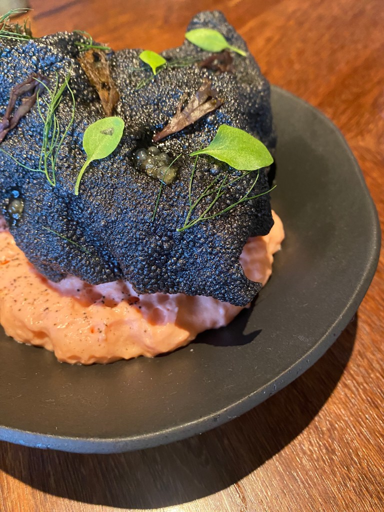 De hecho, uno de los platos que probé, llevaba un crocante de harina de sagú coloreado con tinta de calamar. Se llamaba Trucha, curuba, miel de bosque andino, musgo de mar y sagú.