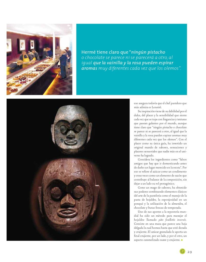 A.Z. Adoro la comida de mar. Me encanta el rollo de langosta, almejas fritas en el restaurante Fiev Islands Lobstar Company en Maine; el pescado fresco de Tsukiji Market en Tokio o el mercado central en Santiago. De restaurantes ‘fine dining’ me gusta Alinea en Chicago, L’ami Jean o Garnaire en Paris; Tom Aikens y Roast en Londres; El Bulli en España, Nobu y Mizutani en Tokio, y Per Se, Jean George y Boloud en Nueva York.